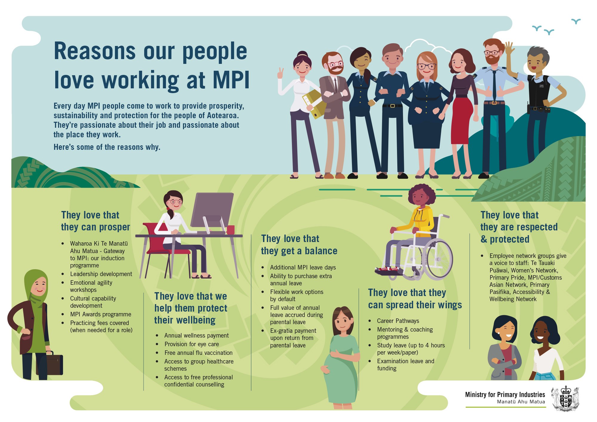 This green and blue coloured infographic poster is headed “Reasons our people love working at MPI”. Some cartoon-like characters of people are shown at the top – a group of 4 men and 4 women. Next to each main text heading are other characters – a woman with a scarf carrying a briefcase, a woman sitting behind a computer desk, a pregnant woman, a woman in a wheelchair, and 2 women talking.