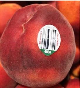 Imported yellow flesh peaches with green fruit sticker PLU number 4044 and 4038. |