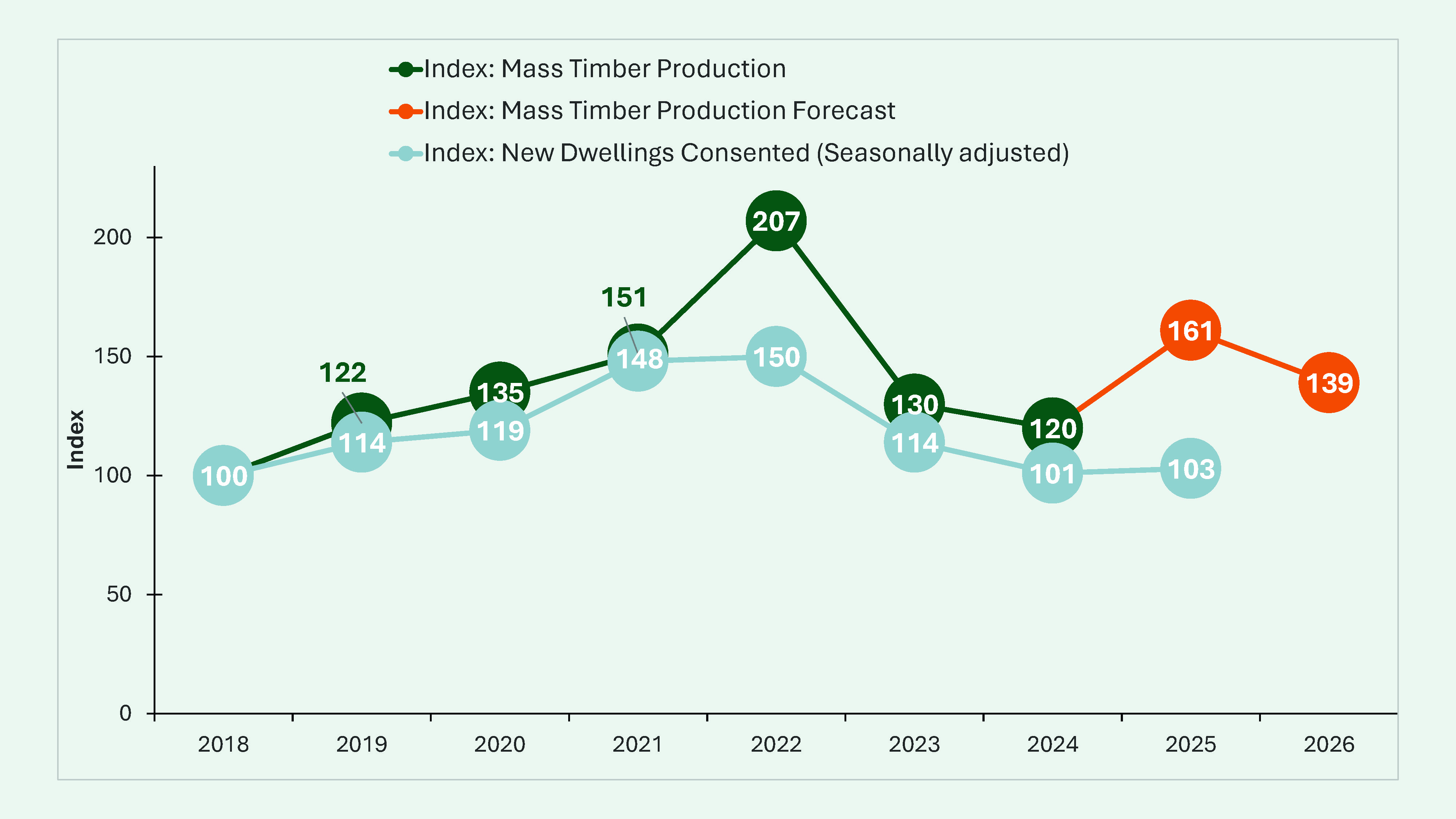An orange line shows the index for the mass timber production forecast. It’s joined to the end of the green line and shows orange index circles for the years 2025 and 2026. The line shows a forecasted increase in 2025 and a decrease in 2026. The forecast index amounts are: